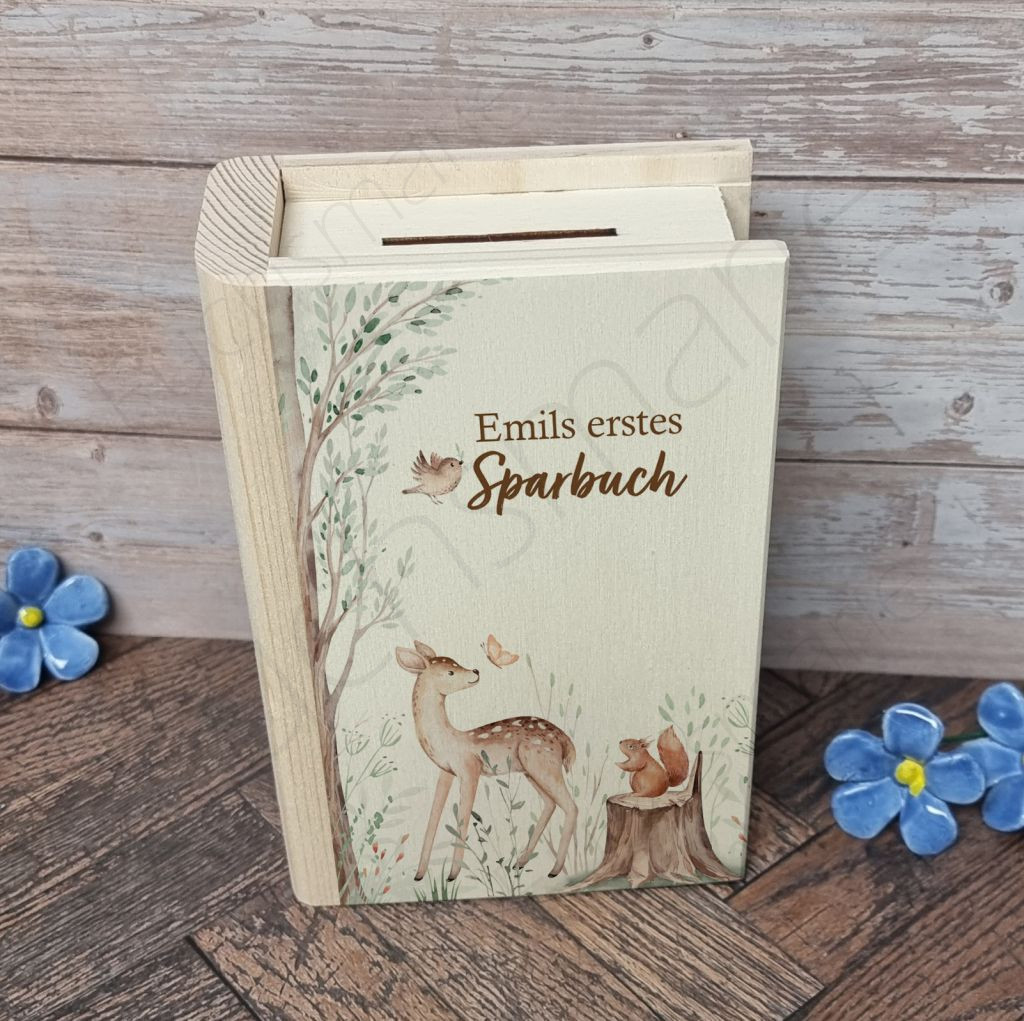 Sparbuch aus Holz Waldtiere